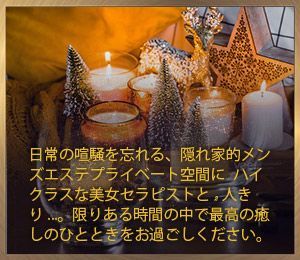 当店は、個室のプライベート空間で、厳選したセラピストによるマッサージサロンです。心地よいツボ刺激と室内に香るアロマも深い安らぎへと導きます。あなたの心と身体に極上のリラクゼーションタイムをお届けします!